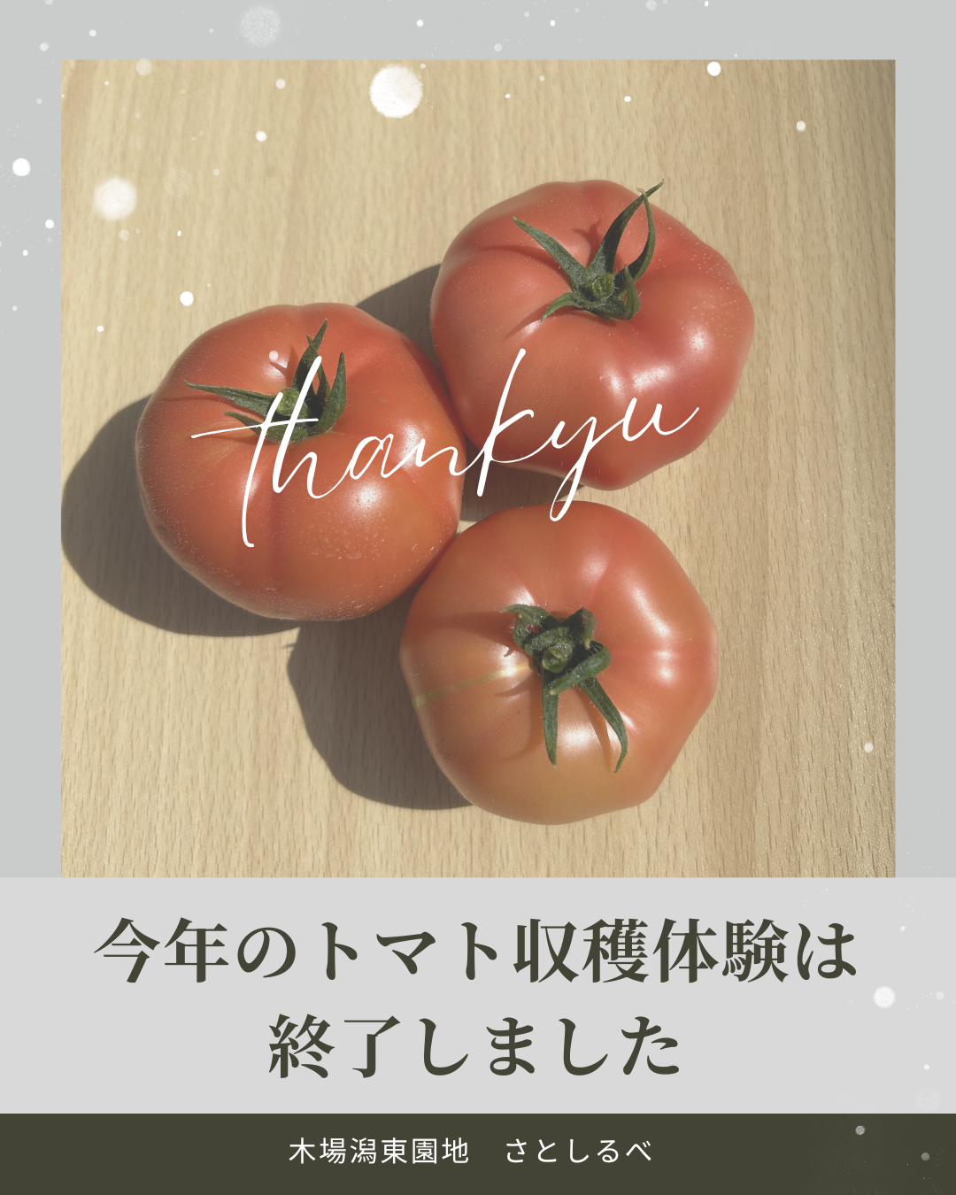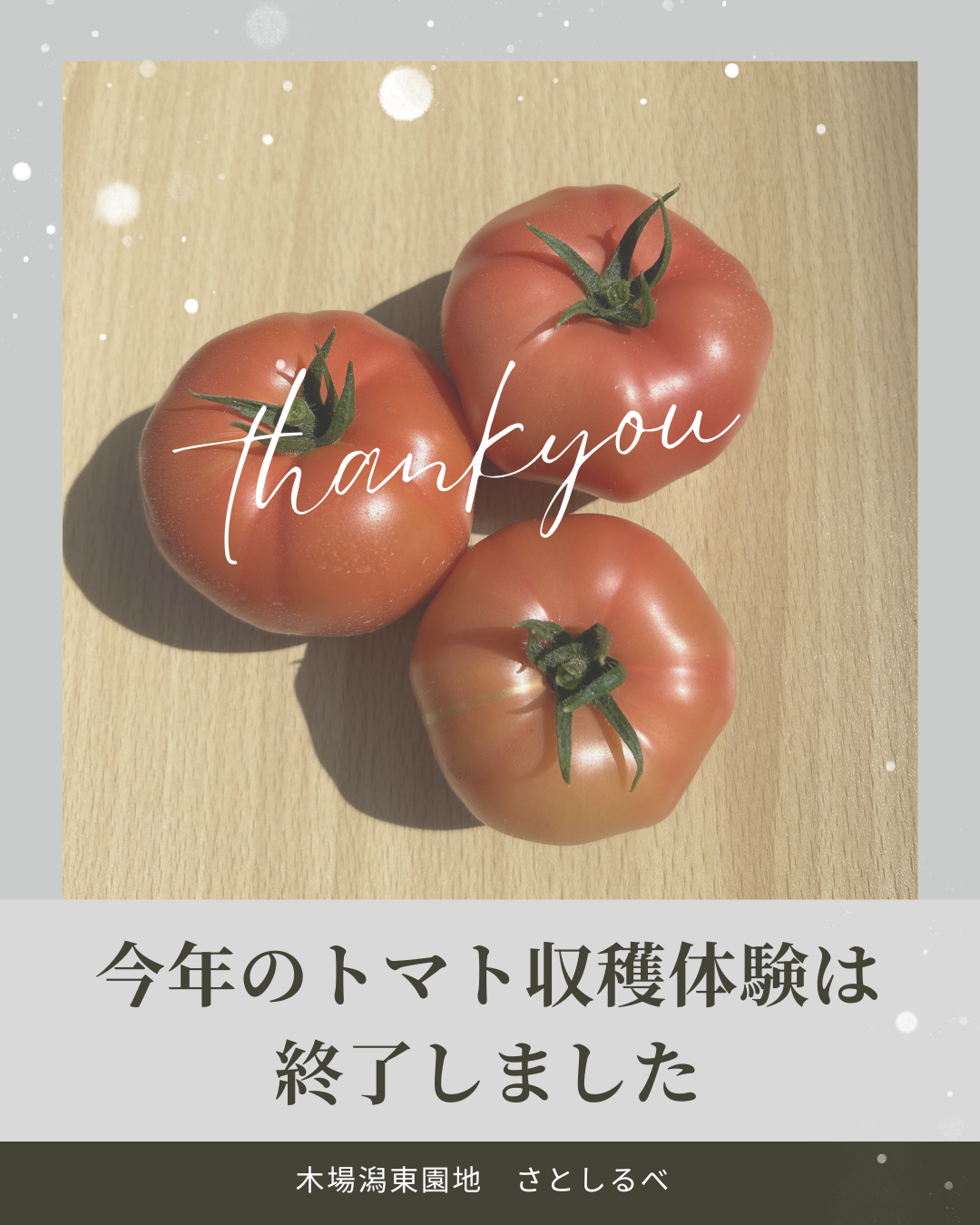 今年のトマト収穫体験は終了いたしました。 今年もたくさんの方に体験していただきありがとうございました。 「ここのトマト美味しい」「楽しかったからまた来ました」などなど、嬉しいお声をたくさんいただきました。 また、来年も、たくさんの方に収穫していただけるように、準備していきますので、楽しみにしていてくださいね!